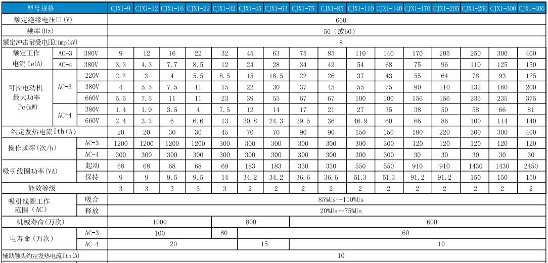 CJX1系列交流接觸器(以下簡稱接觸器)主要用于交流50Hz(或60Hz),額定絕緣電壓為660V,在AC-3使用類別下額定工作電壓為380V時額定工作電流為09~400A的電力線路中。作為供遠距離接通和分斷電路之用,并適用于控制交流電動機的起動、停止及反轉。