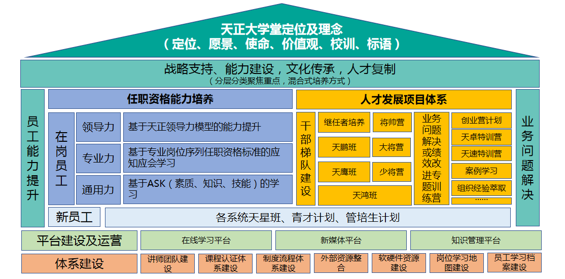 天正大學堂秉持“成就員工,實現夢想”的使命,致力于員工能力建設、企業文化傳承、人才高效復制,基于關鍵崗位能力提升和公司業務問題解決,建立分層分類立體化的人才培養體系,來助力組織與員工的績效提升,支持公司的戰略發展!